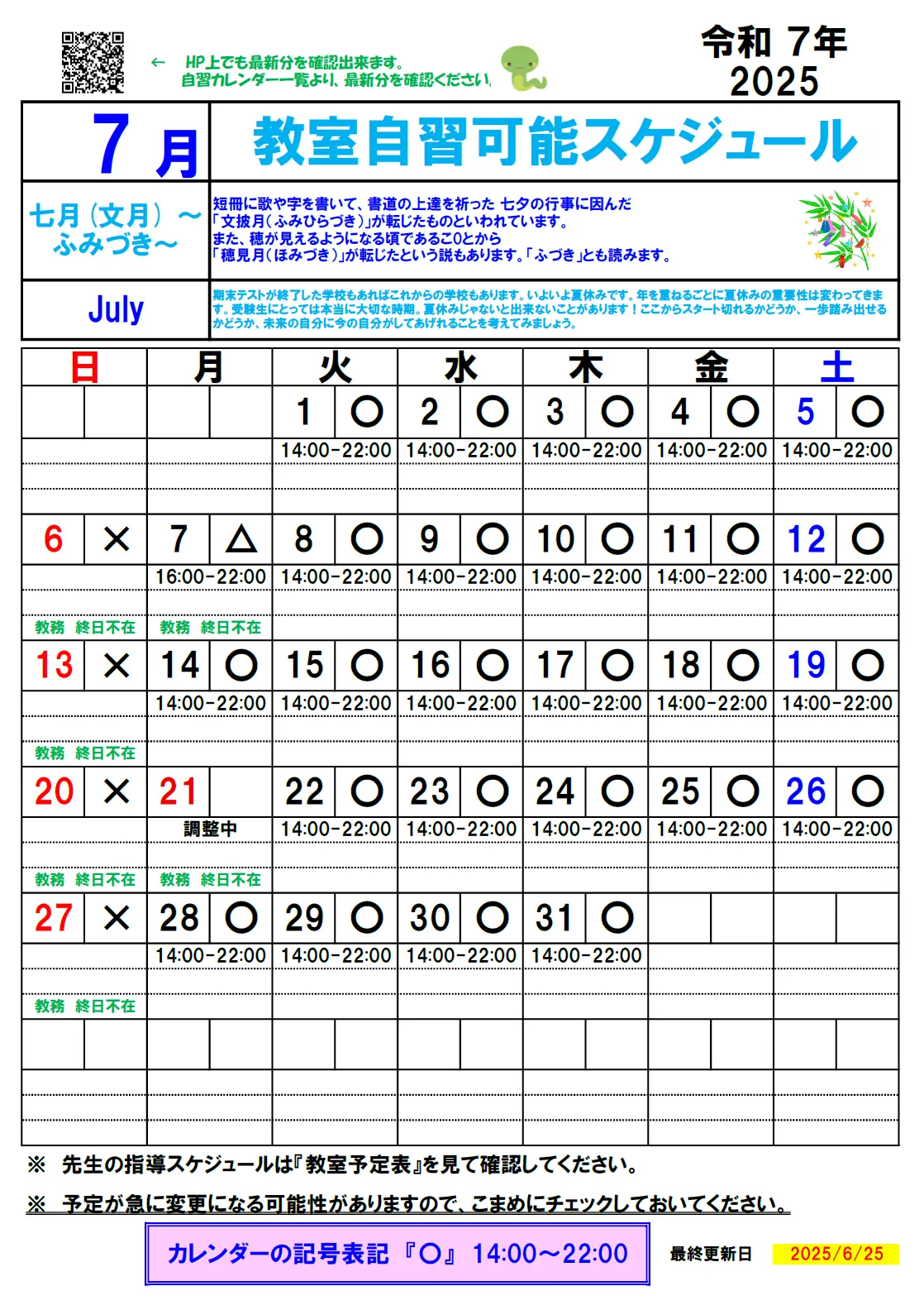 2025年7月の自習カレンダーを更新しました。