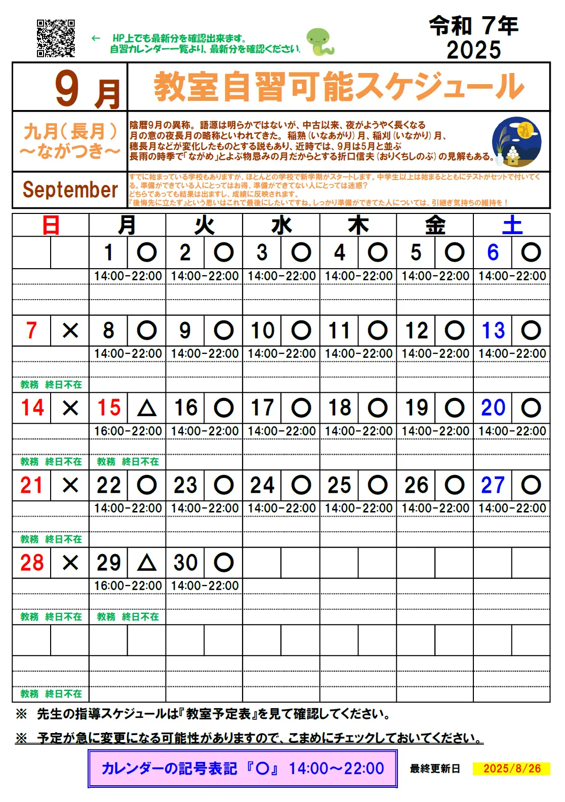 自習カレンダーを更新しました。